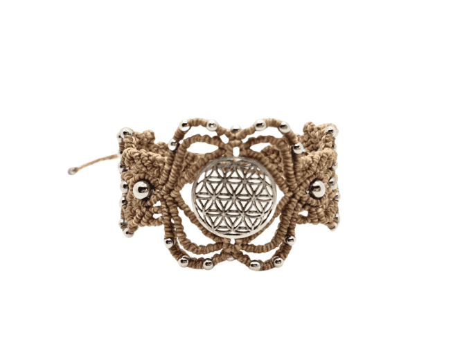 Matériaux : Fil de micro-macramé robuste, perles en acier inoxydable et un médaillon central représentant la Fleur de Vie.